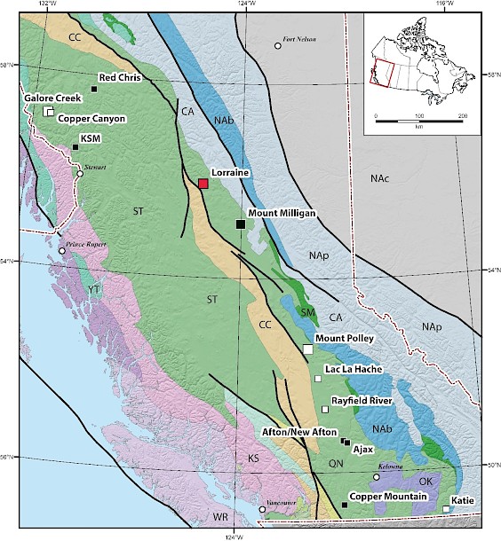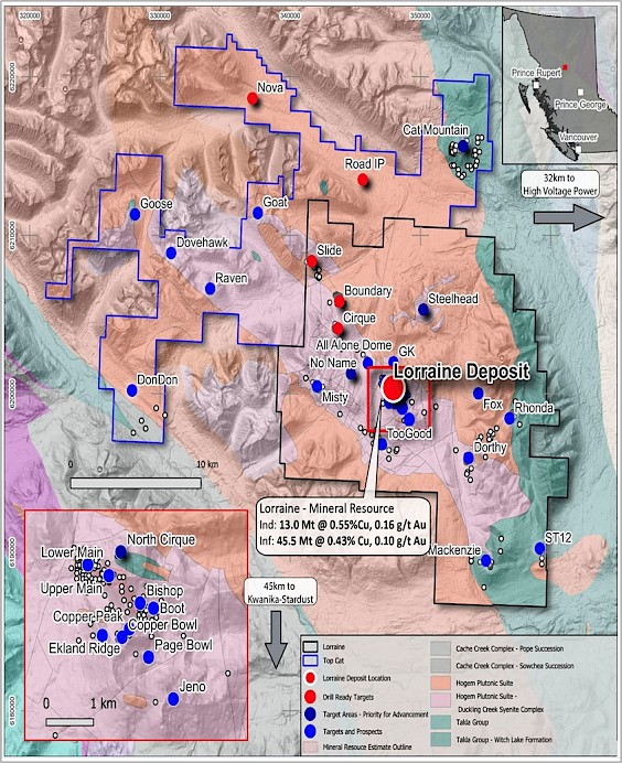 NorthWest’s Lorraine-Top Cat Project is located in north-central British Columbia 45 kilometres north of the Kwanika-Stardust Project (Figure 1) and is hosted by alkalic and calc-alkalic intrusions of the Jurassic Hogem batholith and, to a lesser extent, by Triassic volcanic rocks of the Takla Group. The project has a strong value proposition as it combines the Lorraine deposit and its large, mostly open, 43-101 compliant mineral resource estimate as a base asset with at least 32 defined, but in most cases little-explored, exploration targets. Highlights include: